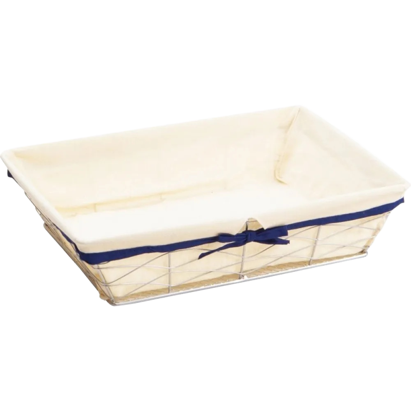 Proposez à vos clients vos assortiments gastronomiques grâce à cette Corbeille en métal argenté doublé d’un tissu écru et d’un liseret bleu foncé. Elle offre une belle contenance par sa forme rectangulaire et ses dimensions généreuses.