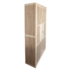 En bois de palette recyclé, composé de quatre étagères et deux portes battantes + serrure à clé.