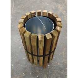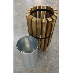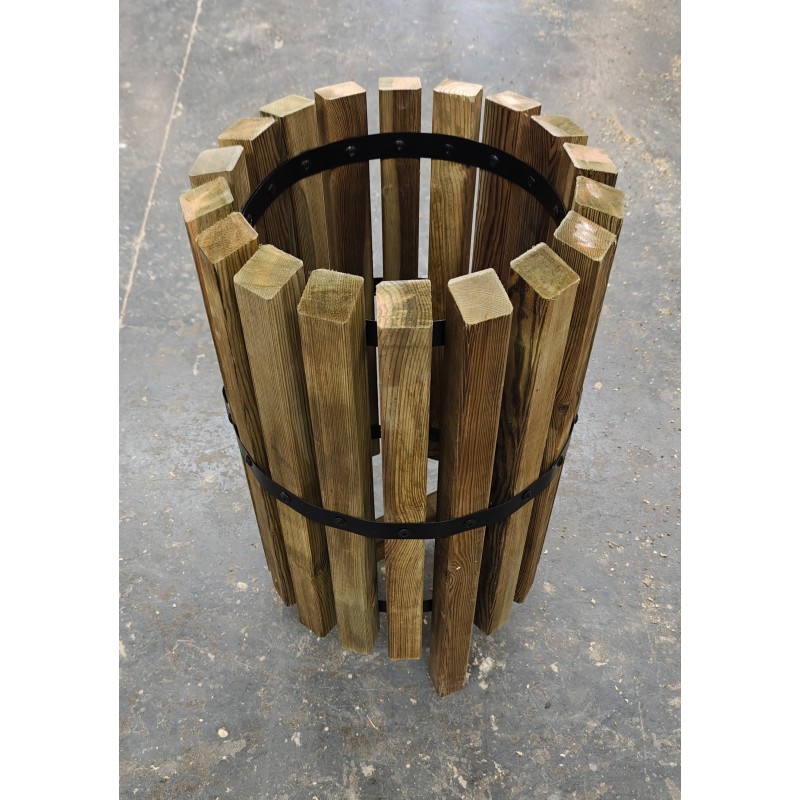 Poubelle urbaine de style moderne fabriquée en pin traité autoclave classe 4, avec cerclage métallique.